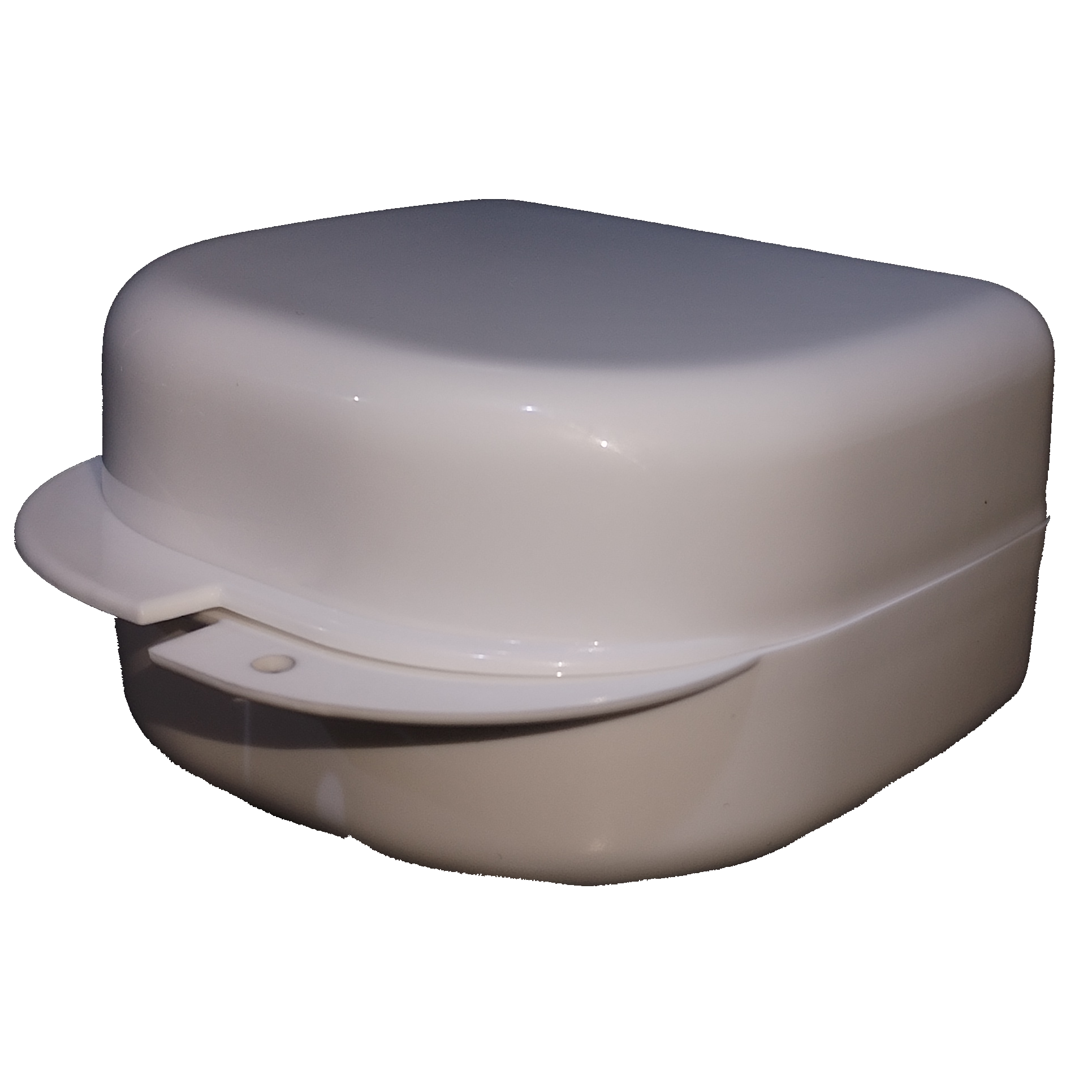 Denture transport and storage case, made of white polypropylene. Easy to open and close securely.